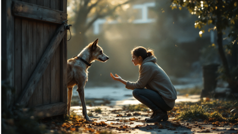The dog appeared at our back gate on a Tuesday morning, ribs showing through matted fur, one eye swollen shut. My neighbor Jim saw it first. “Damn stray,” he muttered, grabbing his hose. “I’ll get rid of it.” But before he could spray,